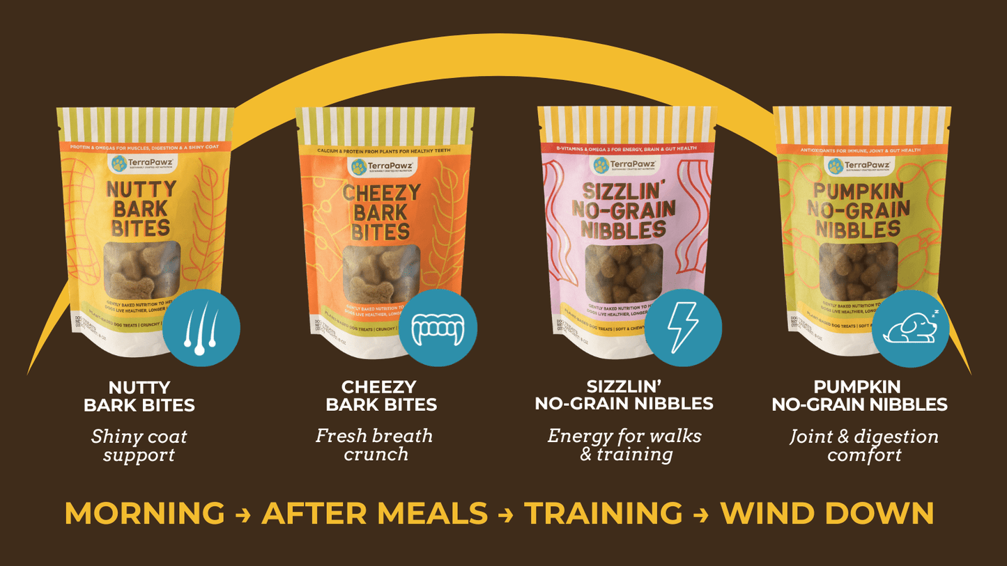 It’s a simple routine built around 4 functional flavors, organized by benefit: Skin + Coat, Teeth + Breath, Hips + Joints, and Energy + Focus. You can rotate flavors to cover all 4 benefits, or start with the ones your pup needs most and build from there. For the full walkthrough, read our Complete Daily Wellness Guide