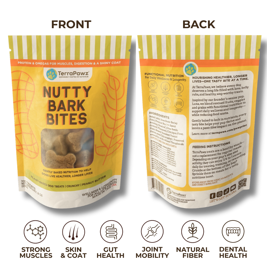 TerraPawz plant-powered treats are packed with pawz-itive perks! We use all-natural, sustainably sourced ingredients—like spent brewing grains and surplus produce—that take extra care to source, clean, and prepare. This labor-intensive process helps reduce food waste while delivering premium nutrition. With TerraPawz, you’re treating your dog to snacks that are wag-worthy, sustainably crafted, and kinder to the planet. It’s a win for your pup and a win for the planet!