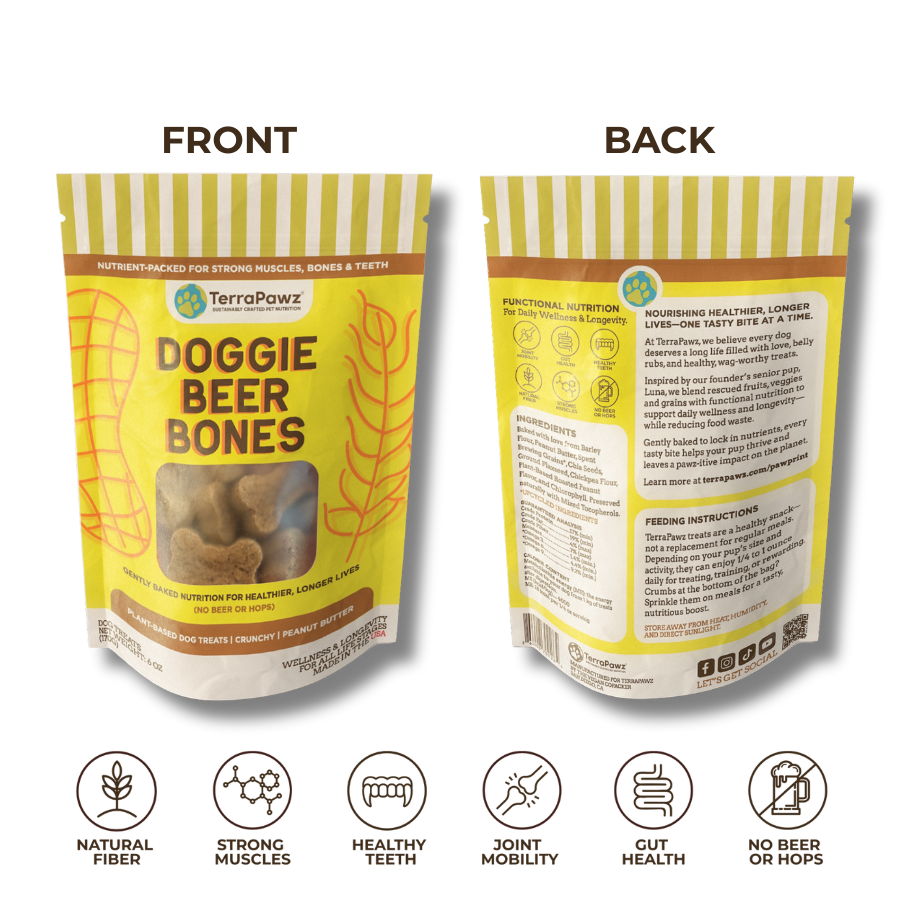 TerraPawz plant-powered treats are packed with pawz-itive perks! We use all-natural, sustainably sourced ingredients—like spent brewing grains and surplus produce—that take extra care to source, clean, and prepare. This labor-intensive process helps reduce food waste while delivering premium nutrition. With TerraPawz, you’re treating your dog to snacks that are wag-worthy, sustainably crafted, and kinder to the planet. It’s a win for your pup and a win for the planet!