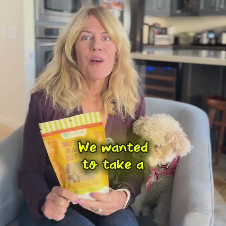NUTTY BARK BITES: Peanut butter-flavored, plant-powered treats with spent grains and omegas to support muscles, joints, and coat health.