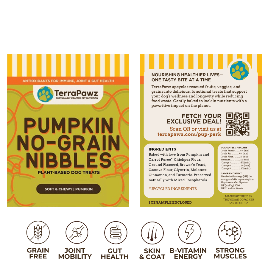 PUMPKIN NO-GRAIN NIBBLES: Grain-free pumpkin treats with antioxidants and B-vitamins to support immunity, energy, digestion, and joint mobility.